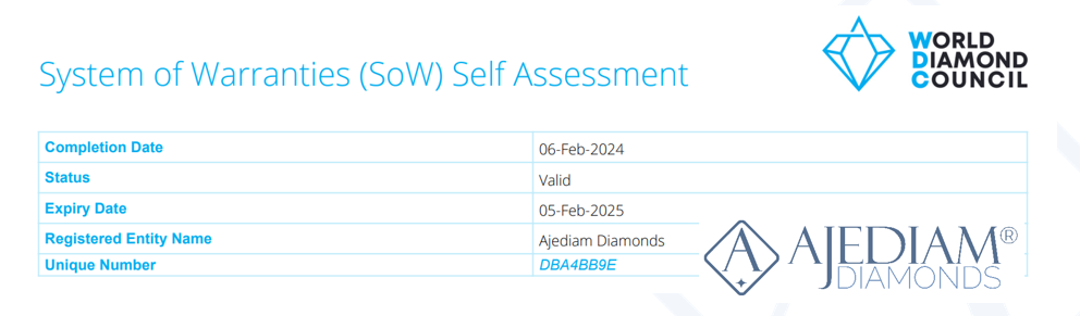 Das System of Warranties (SoW) wurde 2002 vom World Diamond Council (WDC) im Auftrag der World Federation of Diamond Bourses (WFDB) und der International Diamond Manufacturers Association (IDMA) als Selbstregulierungssystem der Branche eingeführt dies würde bedeuten, dass die verkauften Diamanten den Mindestanforderungen des Kimberley Process Certification Scheme (KPCS) entsprechen, das Anfang 2003 eingeführt werden sollte.